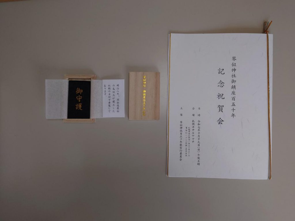 祝賀会は恙なく進み最後は祝宴という形で盛り上がり私も楽しませて頂きました。このような記念祝賀会に参加する機会はあまりありませんので良い経験をしたと思います。(下の写真は150周年記念の御守です。明治8年の開拓使最初の屯田兵が建立した社殿の古材で奉製されているとのこと)